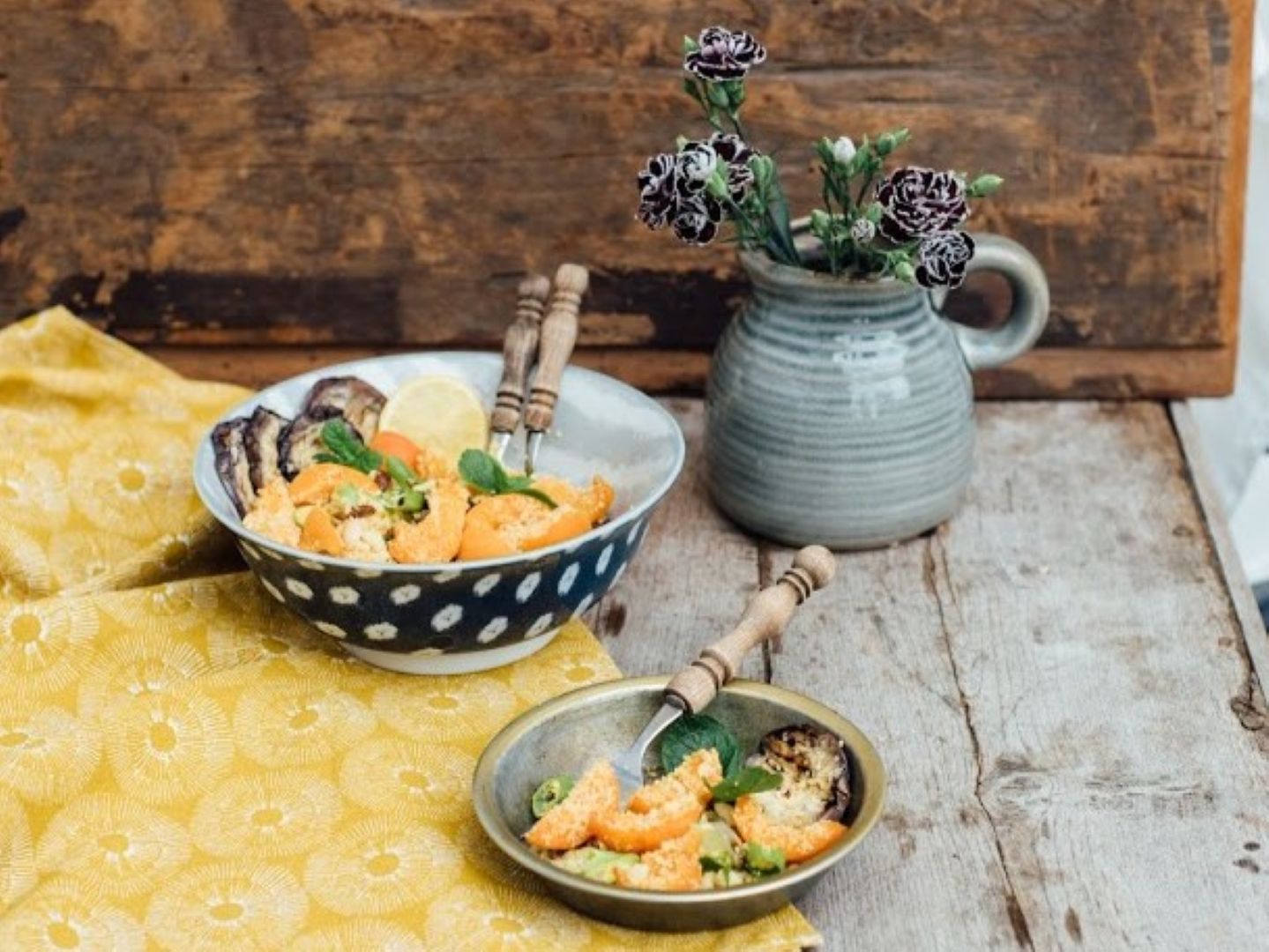 Saffraancouscous, dat klinkt misschien heel fancy en lastig te maken. Niets is minder waar! Saffraandraadjes koop je bij de reguliere supermarkten en zorgen ervoor dat de couscous mooi geel wordt. De combinatie van gegrilde aubergine, zilte kappertjes en zoete sinaasappel is heerlijk. Je kunt er wat vegan groenteballetjes aan toevoegen voor extra vulling.
