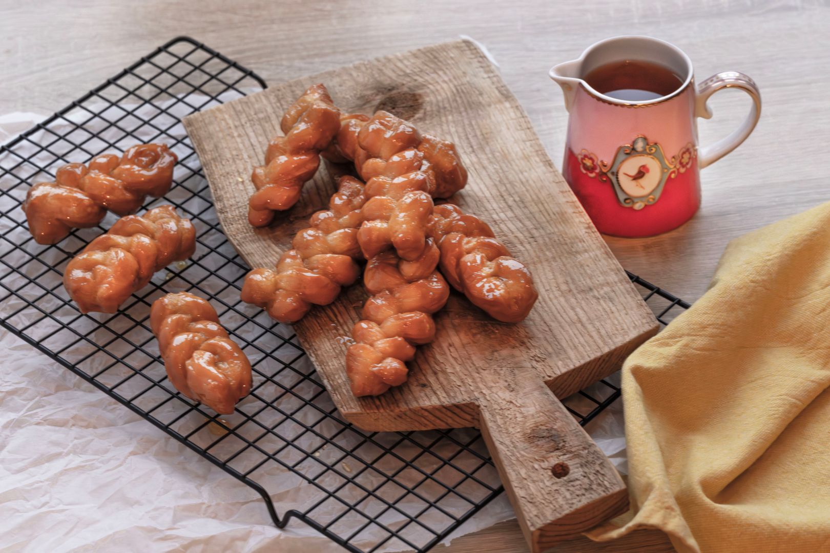 Schenk de siroop in een kom en zet die naast het fornuis of de frituurpan klaar. Zet ook een rooster klaar om straks de koeksisters op te laten uitlekken. Leg er een bakplaat of keukenpapier onder.